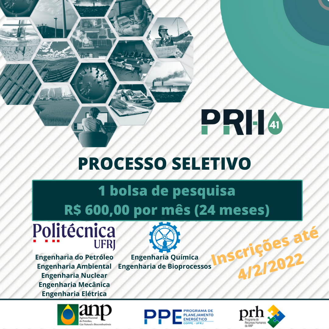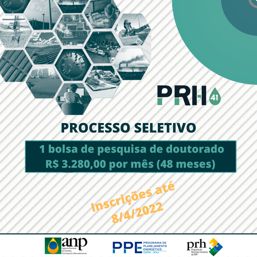 No âmbito do PRH-41, o Programa de Planejamento Energético (PPE) da COPPE/UFRJ oferece bolsas de pesquisa para alunos de mestrado interessados em atuar no setor de petróleo, gás natural, biocombustíveis e energias renováveis. As condições gerais que regem este programa são aquelas definidas pelo Programa de Formação de Recursos Humanos - PRH/ANP, cujas informações estão disponíveis no site da ANP e pode ser acessado neste link.