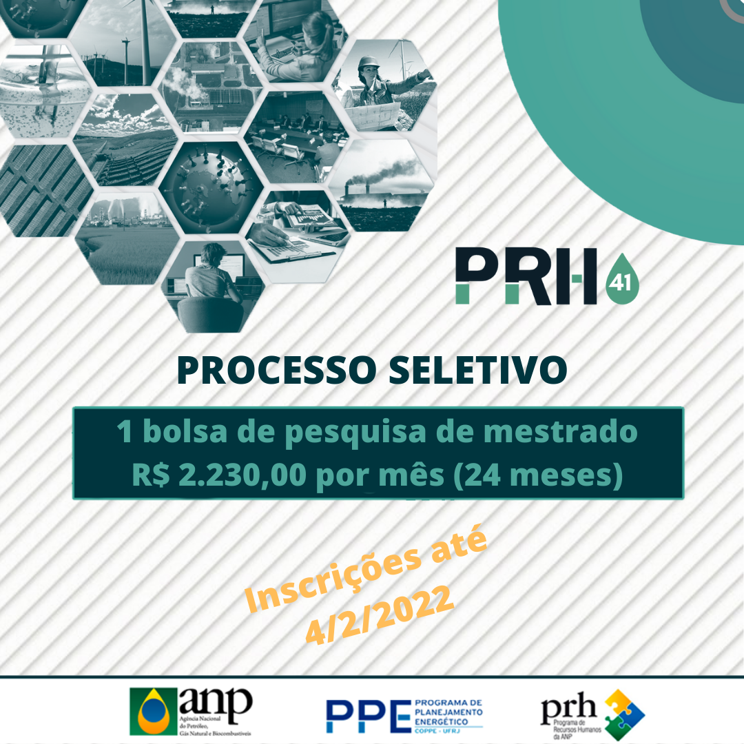 No âmbito do PRH-41, o Programa de Planejamento Energético (PPE) da COPPE/UFRJ oferece bolsa de pesquisa para alunos de mestrado interessados em atuar no setor de petróleo, gás natural, biocombustíveis e energias renováveis. As condições gerais que regem este programa são aquelas definidas pelo Programa de Formação de Recursos Humanos - PRH/ANP, cujas informações estão disponíveis no site da ANP e pode ser acessado neste link.